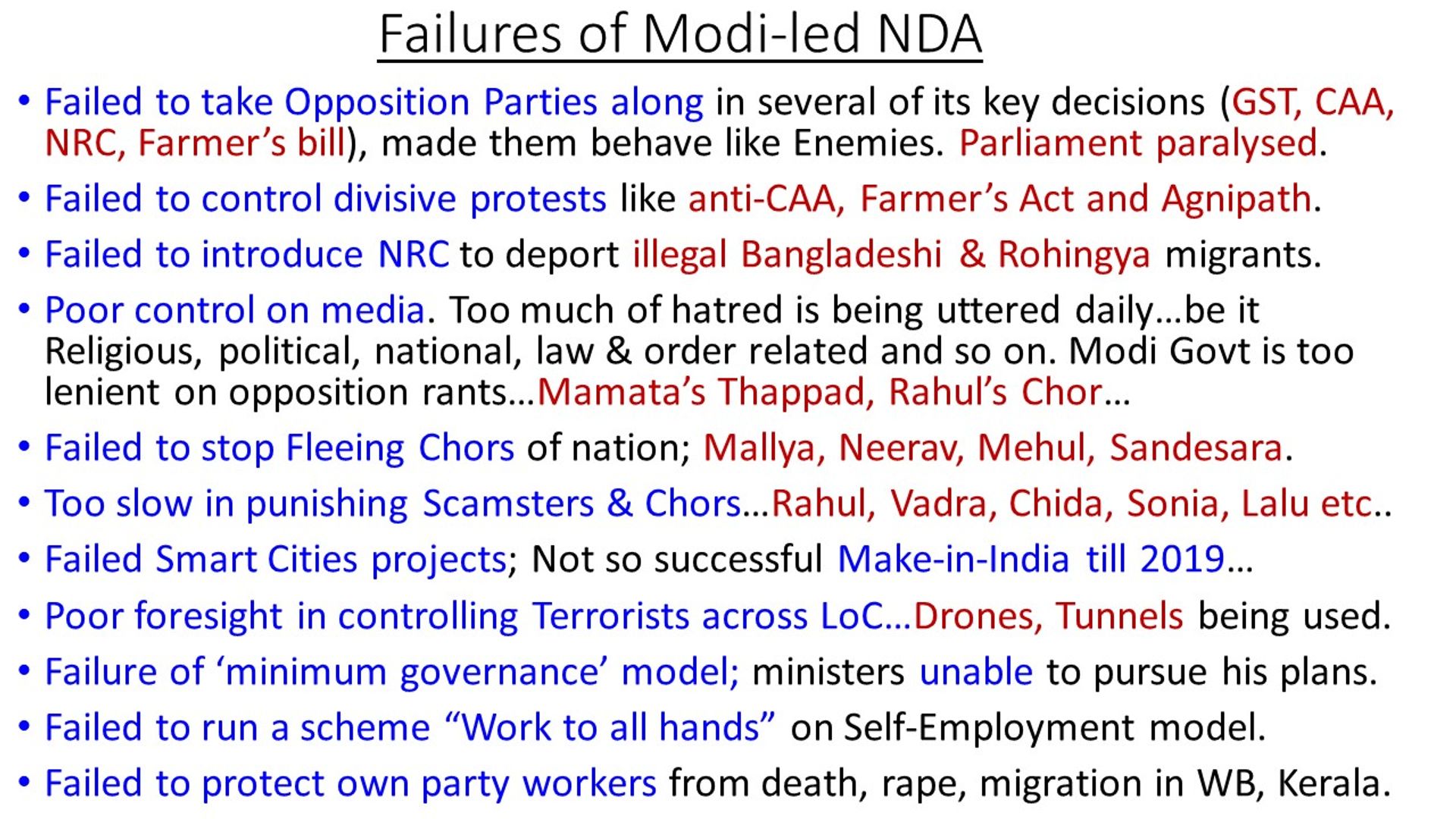 The author will be failing in his duty not to mention some of Modi’s failures too, both in completing the projects as well as his general approach in political dealings and administration. There is no doubt that he is the most popular leader in the world today. However, it is also a fact that he (or his ministers to be more precise), has become more of enemies rather than an adversary for the opposition parties. One may listen to Rahul Gandhi, Mamata Banerjee, Tejaswi & Akhilesh Yadav, spokespersons of CPI, AAP and some others as well, it is filled with hate speech. Clearly, Modi has not been able to take them together in his journey to new India. There are reasons too in this as most of the opposition parties are tainted with corruption, scams, frauds and hence, incompatible for Modi’s respect. This is the reason that these opposition leaders are joining hands in showing down all achievements of Modi Govt. In a democratic set-up, citizens having party affiliations with those scamsters do join in their chorus wrongly though, giving a false appreciation. Modi must do some course corrections in this regard so as to pass the acid-test in 2024.