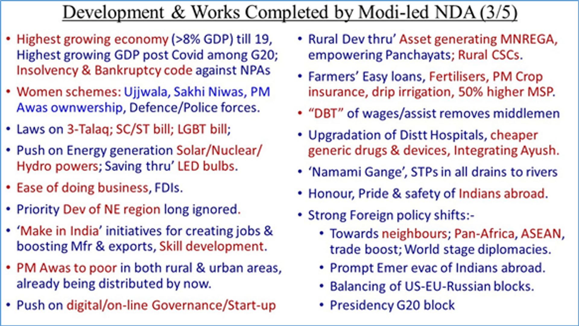 Of course, Modi govt has numerous feathers in his cap the prominent ones mentioned in the text boxes above/below. Schemes like premium-free Health Insurance PM Jan Arogya Yojna, (PMJAY) called ‘Ayushman Bharat’ for 10 Cr BPL families, providing free insurance of upto 5 lakh rupees. His govt introduced Rs 6000 annual allocations under ‘Kisan Samman’ to all farmers of the nation, a Pucca house under PM Awas Yojna (PMAY) for the poor, free provision distribution of grains & LPG to 80 Cr people under PM Garib Kalyan Ann Yojana (PMGKAY) etc have reached all poor/BPL/Covid-displaced/target households. He also tried to address the burning problem of unemployment among 360 million Youths & Women through an innovative security-free ‘Mudra loan’ for self-employment that has alleviated the livelihood of as many families. It is a fact that several crores of people were laid-off in the unorganized sectors during Covid19 but most of them have restarted/rejoined their works by now. The financial stability of the nation has been achieved through a sustained GDP growth and a reduced inflation. Its’ impact is clearly visible.