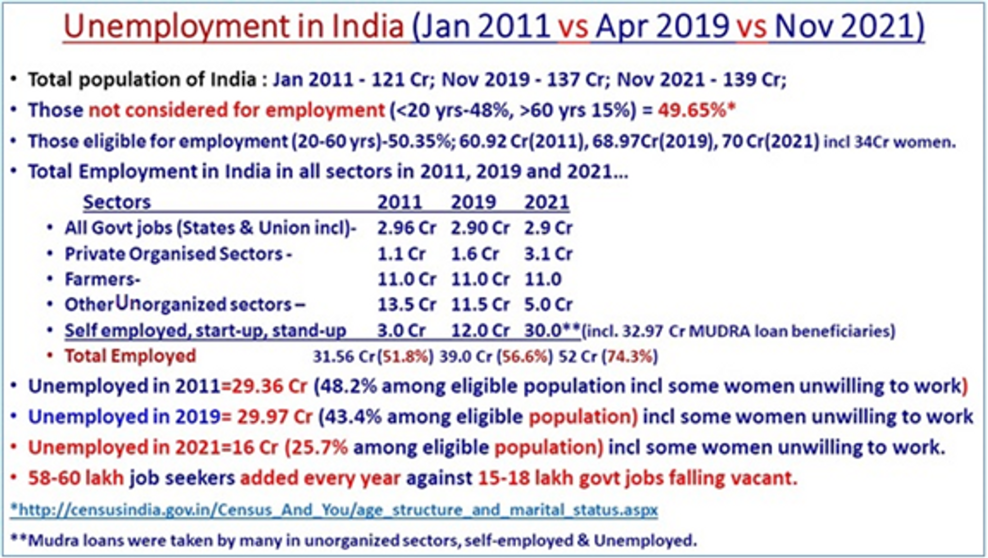 Unemployment in the country has eased out considerably with the self-employment schemes. The statistics of the unemployment in 2021 vis-à-vis 2011 in the text box clearly shows to have declined from 48.2% among the eligible population to 25.7%, nearly half. Surely political opponents are crying ‘unemployment’ and high inflation to hide their own failures (read ‘विपक्षी राज्य सरकारें निकम्मी हैं; मोदी सबको रोजगार दे’, https://thecounterviews.com/articles/incompetent-opposition-ruled-state-govt-modi-to-give-employment/).