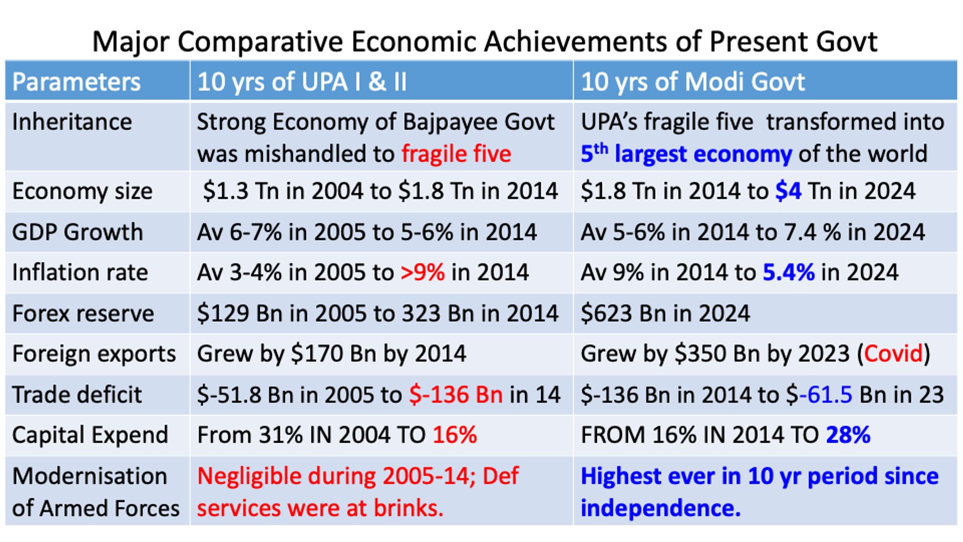 यह श्वेत पत्र मुख्यतया इसलिए लाया गया है कि वे कौन सी प्रयास हैं जिससे भारत टूटने लायक ५वीं अर्थ व्यवस्था से मजबूत ५ अर्थ व्यवस्था में आ गया जिसमें सरकार की आर्थिक सशक्तिकरण उन हर बिंदुओं पर सशक्त और सक्षम हुआ है जो UPA I & II के दौरान बुरे स्थिति में था। निम्नलिखित टेबल इसे दिखा रही है।